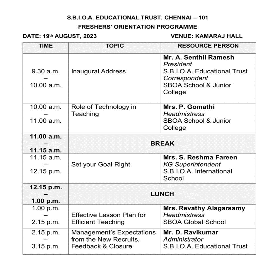 The session was inaugurated by Shri. A. Senthil Ramesh, President of the SBIOA Educational Trust, who addressed the gathering with inspiring words of encouragement. This was followed by an insightful presentation by Mr. D. Ravikumar, Administrator, who outlined the Management’s Expectations from the new teachers.